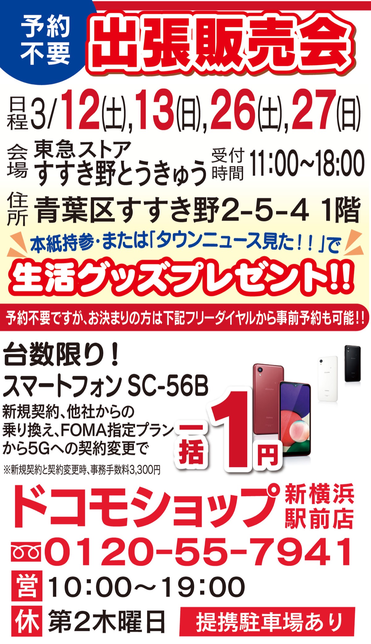 ドコモショップ新横浜駅前店は、「東急ストアすすき野とうきゅう」で出張販売会を開催する。
