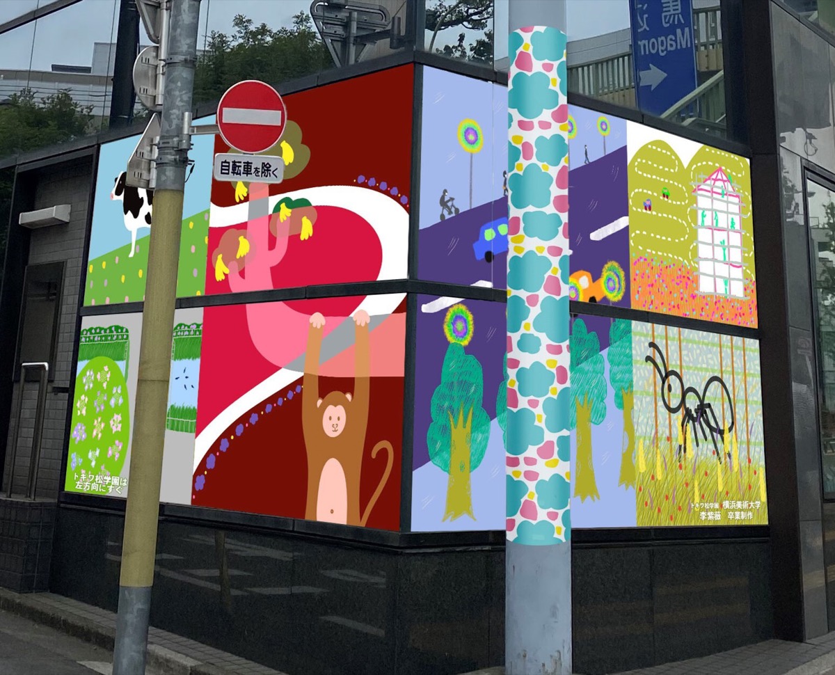また、同取り組みの一環として城南信用金庫の碑文谷支店で壁画アートを制作。当日は壁画を描いた同大研究生の李紫薇さんも出席し、川本理事長より感謝状が渡された。李さんは、壁画に動物や自然を色鮮やかに描いている=写真。