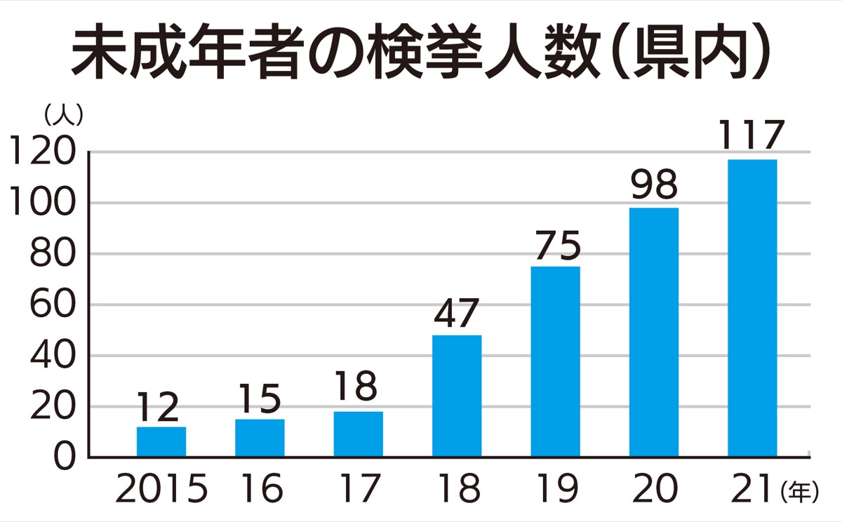 大麻所持などで検挙された県内の未成年者は2017年までは15件前後で推移していたが、18年に47件と急増。昨年は117件だった。覚せい剤やその他薬物は横ばいだが、大麻だけが増え続けている。