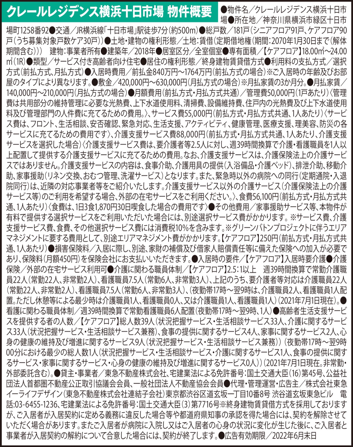 東急不動産HDグループ「クレールレジデンス横浜十日市場・ケアフロア」 要介護者向け介護住宅