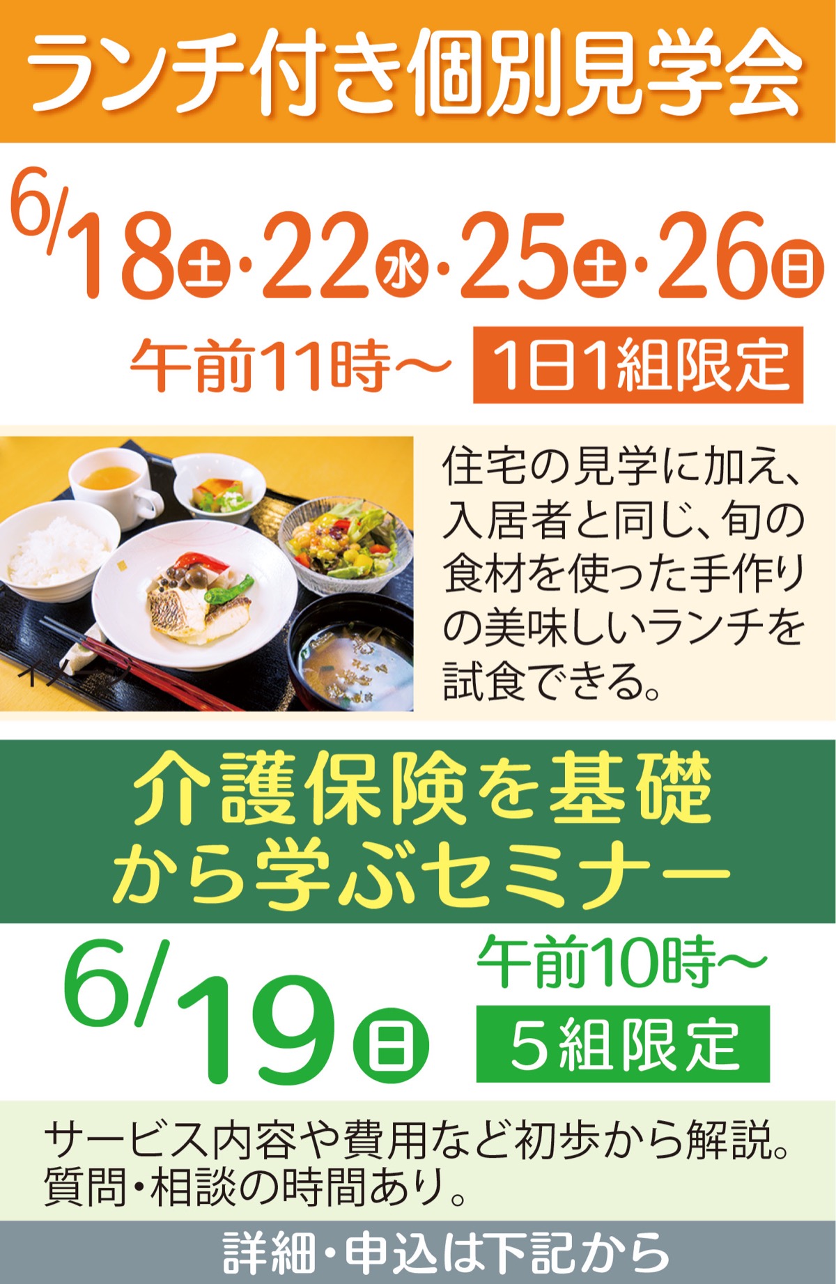 6月は、配偶者や親の介護を続けている、または介護を見込んでいる家族を対象に、参加無料のランチ付き個別見学会や介護保険セミナーを開催=左記表参照。人気の催しなので早めに予約を。