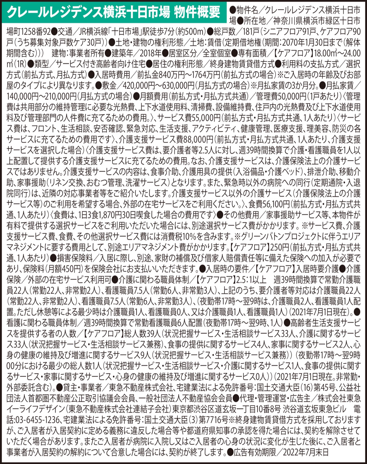 東急不動産HDグループ「クレールレジデンス横浜十日市場・ケアフロア」 要介護者向け介護住宅