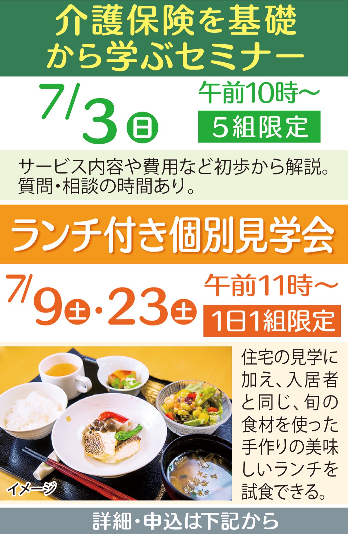 7月3日(日)午前10時から介護保険を基礎から学ぶ無料セミナーを開催。また、9日(土)と23日(土)の午前11時からは手作りで入居者から大好評の食事を試食できる「ランチ付き個別見学会」も実施。