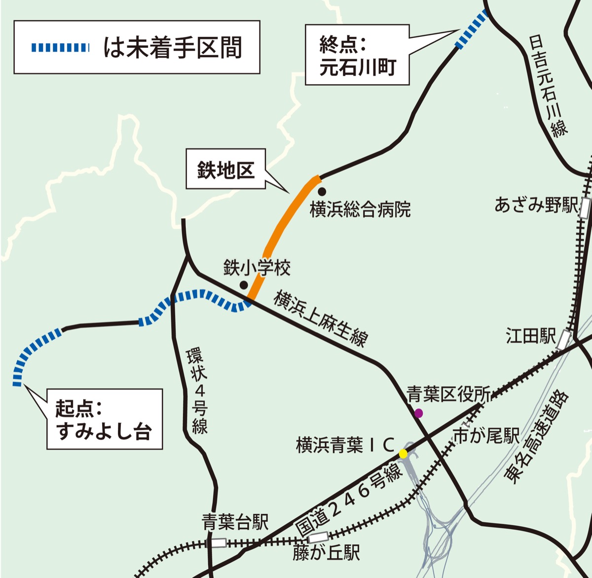 これまでに、荏子田からもみの木台までの約1・8Kmと、鴨志田町の約0・7Kmを整備。日吉元石川線と横浜上麻生線をつなぐ鉄地区などの区間は15年度までに着手予定だったが、財政状況の変化で遅れていた。