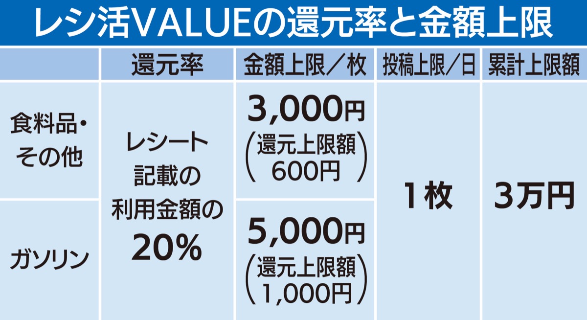 レシート1枚当たりの利用上限金額は3000円(還元額上限600円)。ガソリンの場合は5000円(還元額上限1000円)。11月30日までの期間を通し、1人当たり3万円(利用金額15万円)が上限となる。