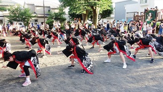 コロナ禍のため飲食はなし。初日はしらとり台保育園がサブちゃん祭りを踊った。2日目は田園都市幼稚園がチアリーディング、さつきが丘小学校がソーラン節とバトンを披露。子どもたちの舞台の後は盆踊りの音楽を会場で流すと、円になって踊る参加者の姿も見られた=写真下。