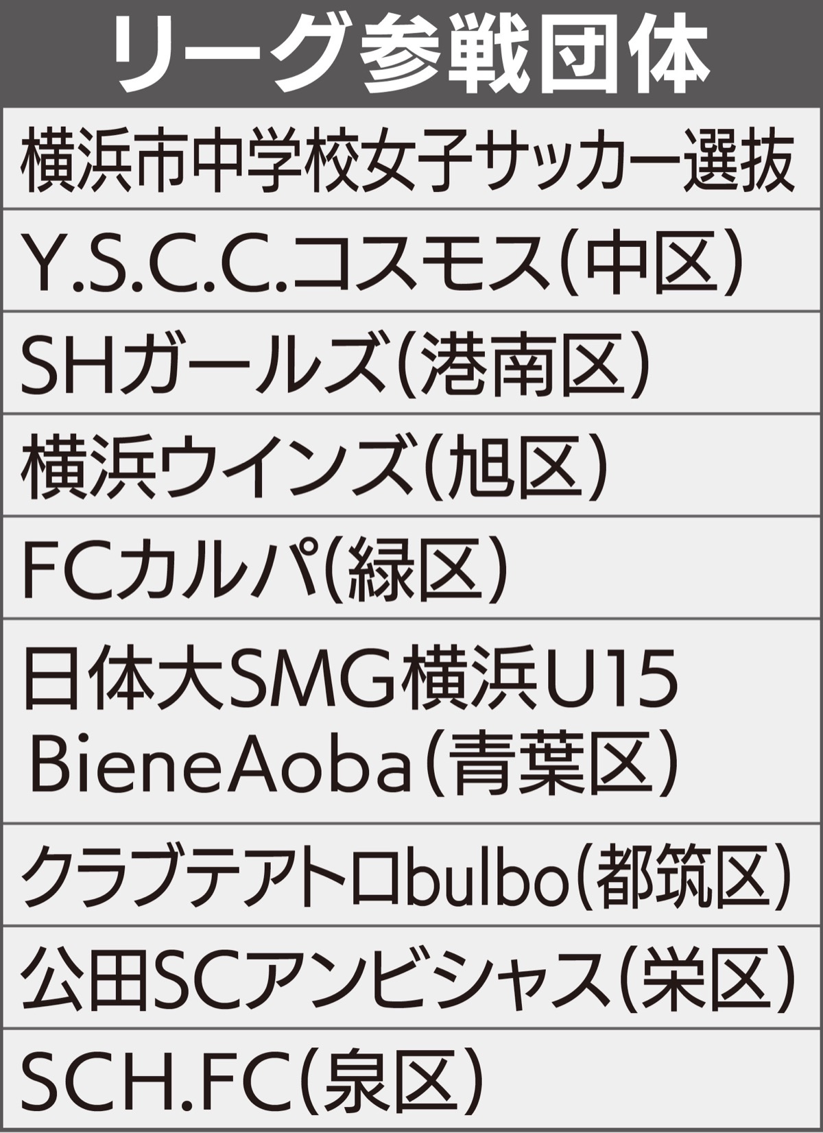 横浜市内で現在、女子中学生のサッカーリーグ「U-15ガールズリーグ」が行われている。女子選手にとって中学進学後にプレーを続ける場が少なく、競技離れが全国的に課題となる中、横浜サッカー協会が試合機会を作ろうと昨年新設。競技人口の底上げに取り組んでいる。