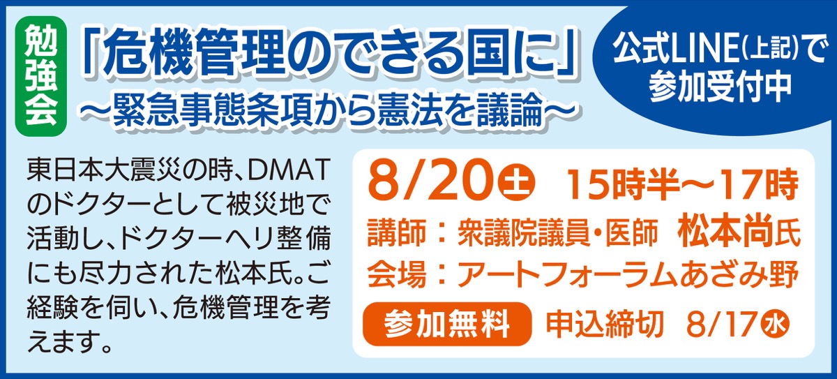 災害対策は自助努力も必要ですが、行政の準備は何より重要です。特に東日本大震災の時の様に行政機能が麻痺をすると国民は大迷惑です。当時「津波で流された車を所有者の同意なしに処理できない」という間抜けな運用が問題になりました。私は緊急事態条項に関しては、平時にこそ議論すべきと考えます。8月20日(土)に災害医療のプロを招いて勉強会を行います。この機会に一緒に考えませんか?上記LINEで参加受付中です。また、危機管理の意識調査もしています。LINEからご協力願います。