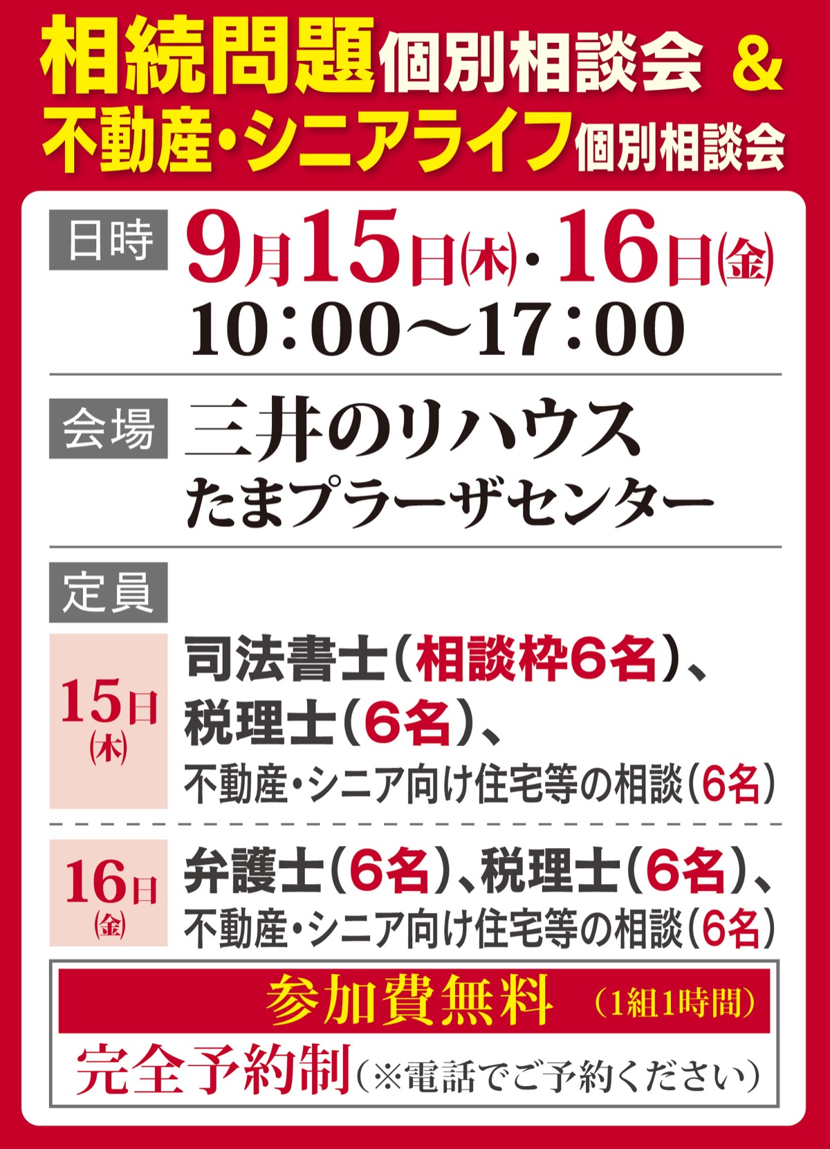 「我が家の相続税はいくら?」「遺言書の作り方って?」「認知症の父親名義の自宅の売却は?」などといった悩みのある人は必見。相続や遺言、成年後見制度、不動産などの疑問を専門家に個別に相談できる無料相談会が9月15日(木)と16日(金)に、三井のリハウスたまプラーザセンターで行われる。完全予約制。