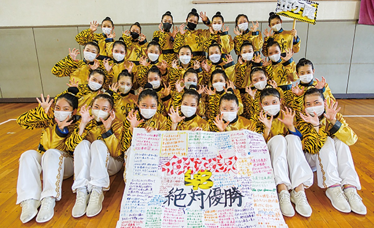 ビッグクラスは40人まで出場できるが、28人だからこそ「迫力を表情や構成でステージ全体を使えるように工夫した」と平本さん。予選会では、人数が揃わず日々、構成を変えるハプニングもありながらも部長の室谷実加さん(16)は「先輩たちがつないできた連続出場を途切れさせないようにとプレッシャーはあったが、夢の全国大会出場を叶えられてうれしい」と笑顔を見せた。