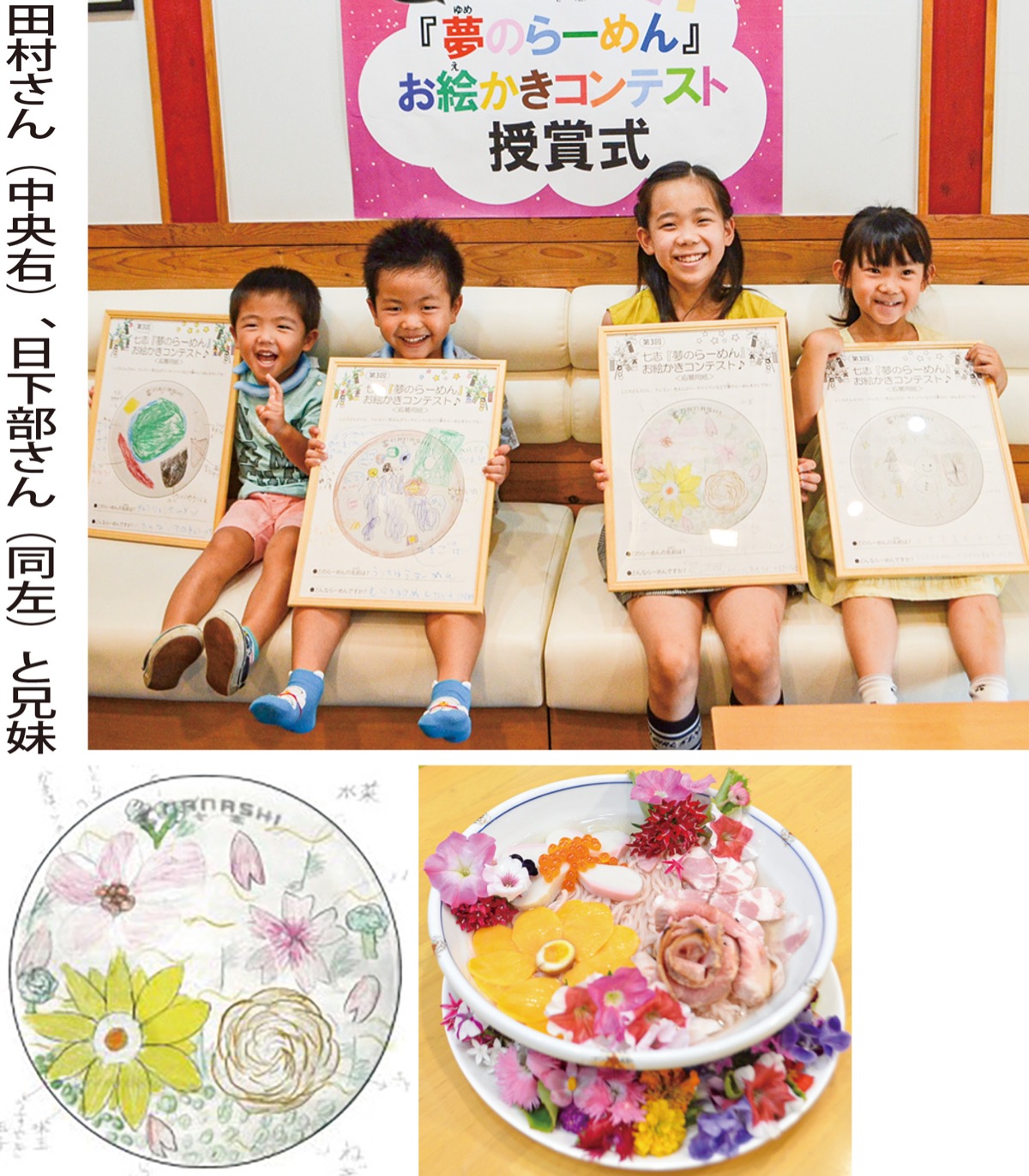 田村さんの作品は丼の中に色とりどりの花が咲き誇るもの。河口敏郎総料理長と商品開発の木崎良哉さんが何度も試作を重ね、桜パウダーを練り込んだピンク色の麺、ハムやチャーシューで作られた花に加え、本物の食べられる花も用いて忠実に再現した。ラーメンを見た田村さんは「絵で描いたよりも豪華」と満面の笑顔を咲かせた。家族で常連だという田村さんは「始めから最優秀賞を狙っていた」と言い、受賞の瞬間は飛び上がって喜んだという。授賞式には社長賞の日下部陽音さんも招待された。