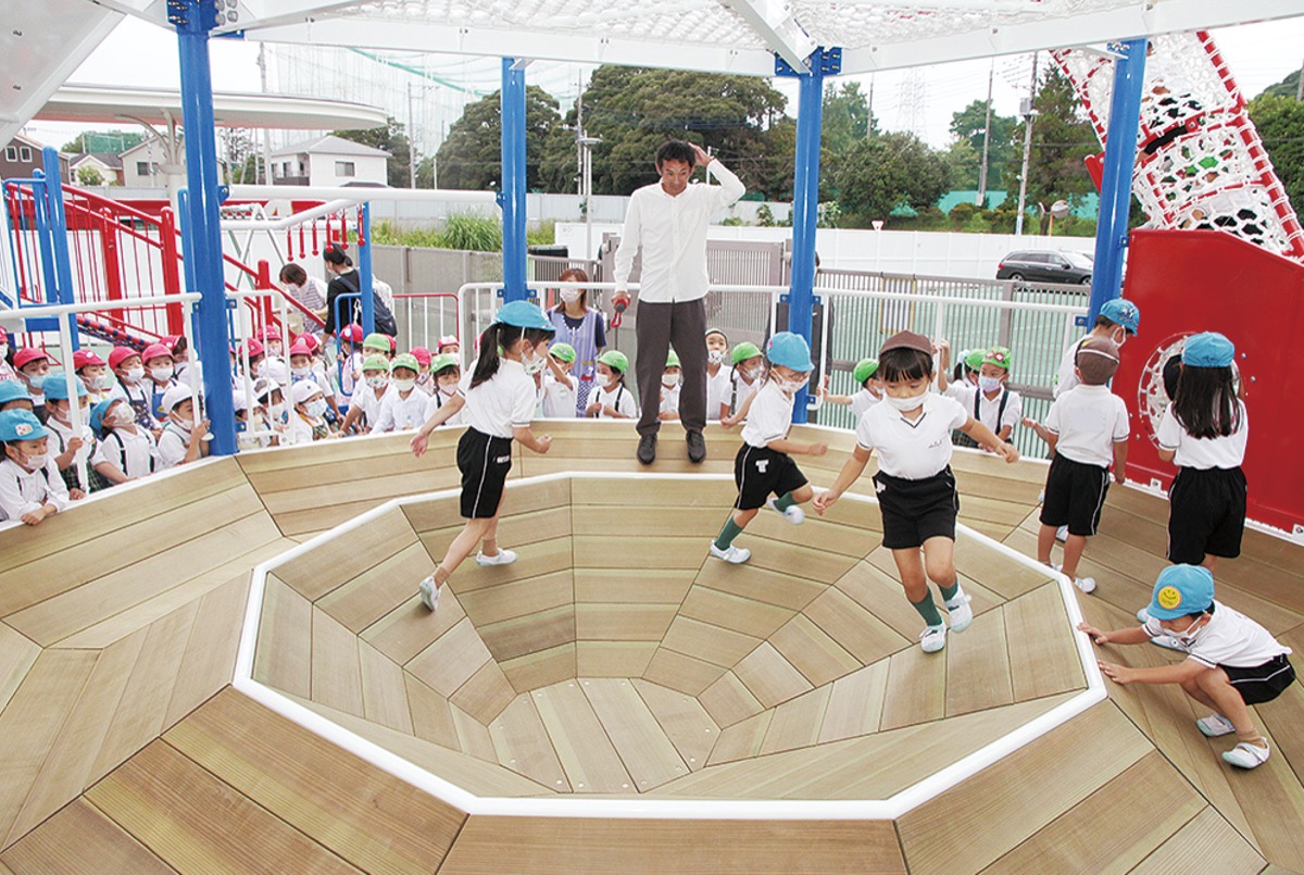 同遊具は元陸上選手の為末大さんが監修したもの。2階建てで、1階には2重のスラローム、2階にはネットが張られている。いずれも不安定な足場で、遊びながら体幹を鍛えられることが特徴だ。5月に発表されたばかりで、全国でも2園目の導入となった。