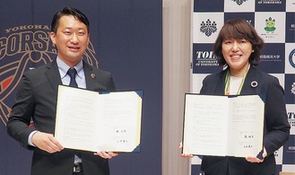 青葉区鉄町にある桐蔭横浜大学(森朋子学長)と、株式会社横浜ビー・コルセアーズ(白井英介代表取締役)が10月7日、地域・社会貢献および、学生やアスリートに対する人材育成に寄与することを目的に、連携・協力に関する協定を締結した。
