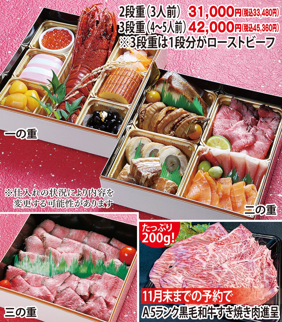 国産伊勢海老やイベリコ豚の生ハム、自家製スモークサーモンなど彩りも鮮やかな贅沢重。さらに最高級A5ランク黒毛和牛のローストビーフがギッシリ並ぶ。今年は11月末までに注文の人に限り鹿児島県産A5黒毛和牛すき焼用ロース肉をプレゼント!おせちの引取りは12/31昼頃店頭で。