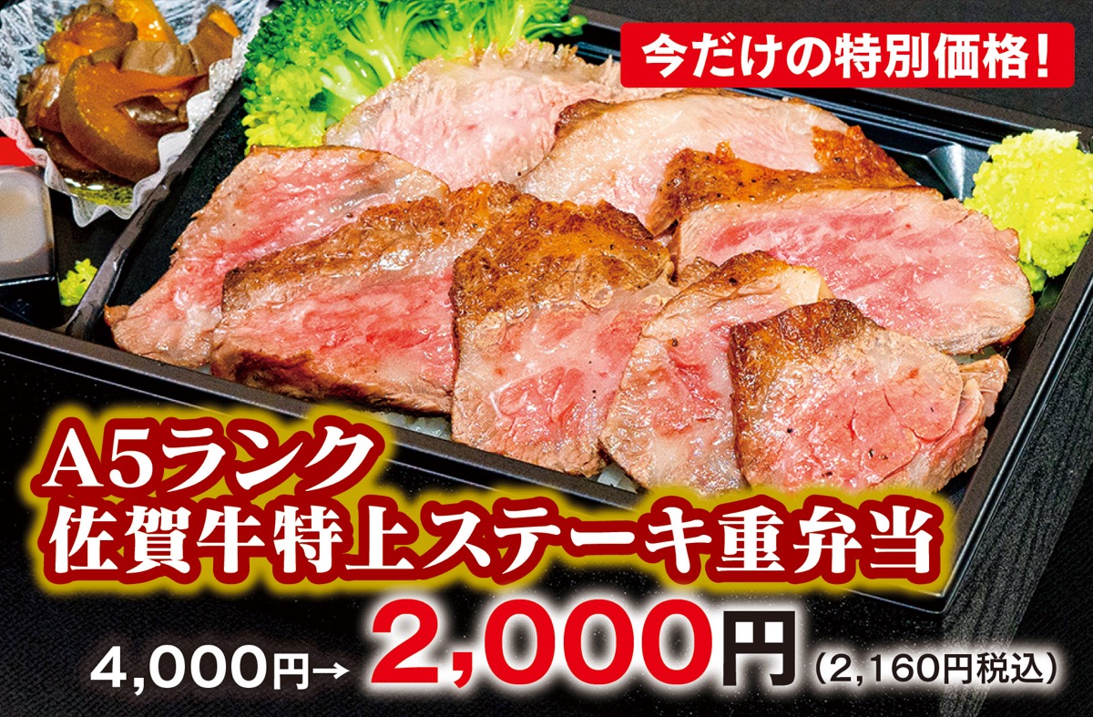 精肉の価格が上昇している中、開店12周年を迎えた同店では「美味しいお肉を味わってほしい」との思いから、「A5ランク佐賀牛特上ステーキ重弁当」を11月末頃まで特別価格で販売する(無くなり次第終了)。通常なら4000円相当の最高ランクのステーキが、半額で食べられる大チャンス。この機会をお見逃しなく。弁当・店内ともに事前【電話】予約を。