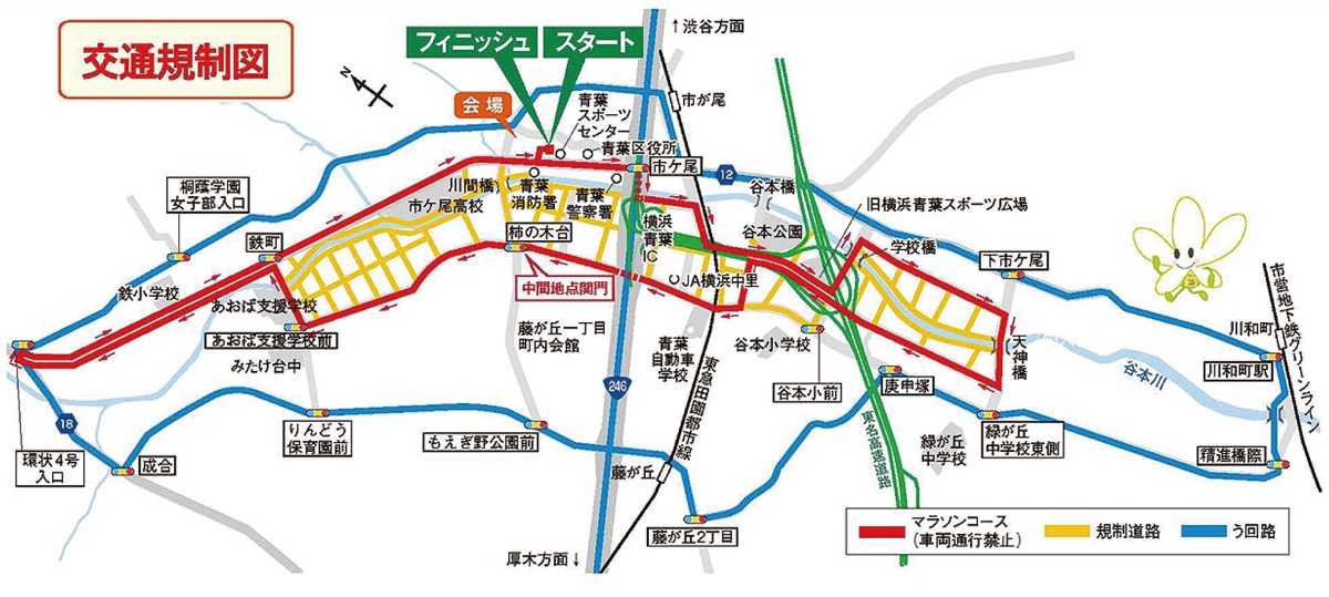 マラソンコースは青葉区役所第1駐車場をスタートし、南端の天神橋を通過後、北上。環状4号入口交差点を折り返して駐車場へ戻る10Km。コースとその周辺道路で、全面通行止め(バイク含む)となる。主な交通規制区域は【1】横浜上麻生道路(市ケ尾交差点から環状4号入口交差点)、【2】谷本小前交差点からあおば支援学校前交差点、【1】【2】に交差する道路すべて。