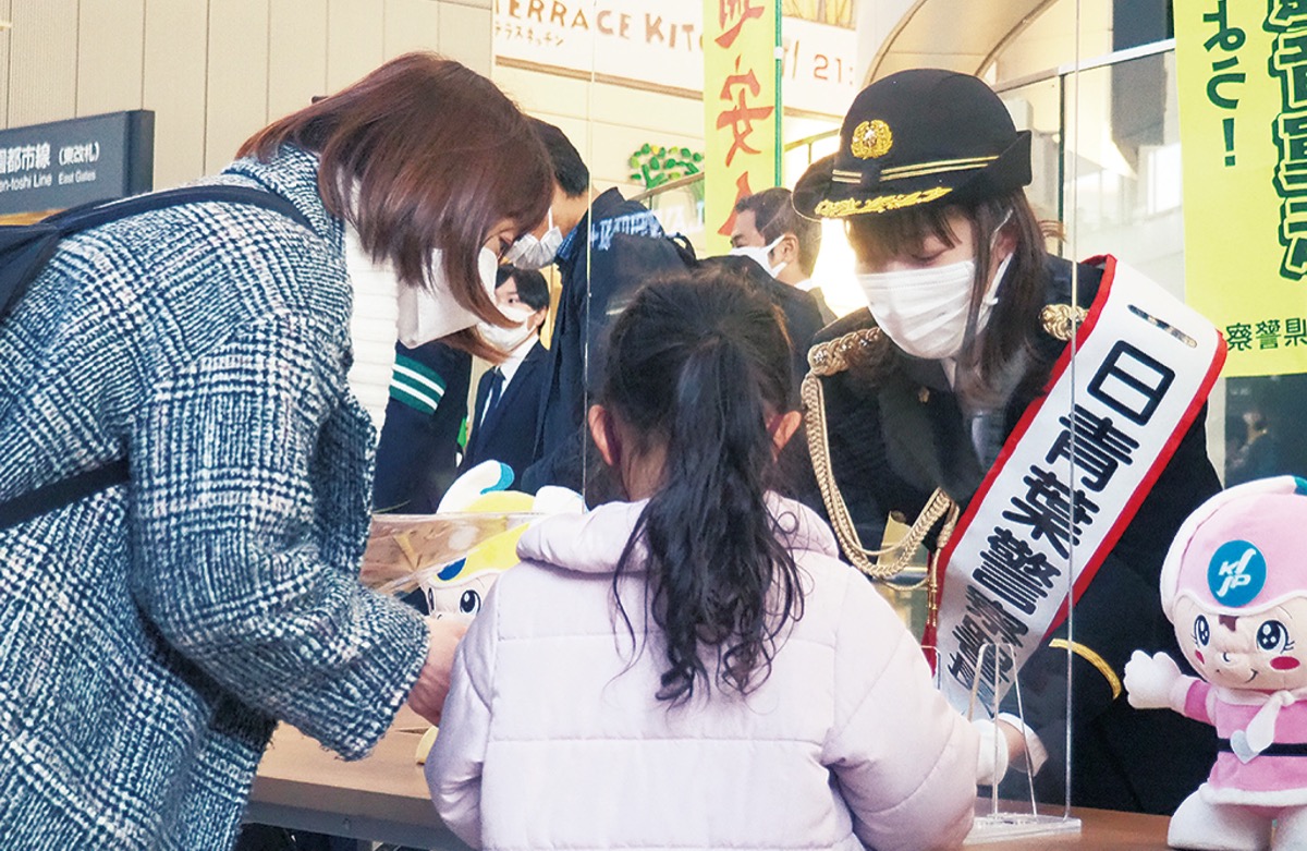 この日は、「ゆずり合いの気持ちを持って」との願いから、街行く人にゆずと啓発物品を配布。阿部一日署長も率先して配布に参加すると、長蛇の列ができていた。