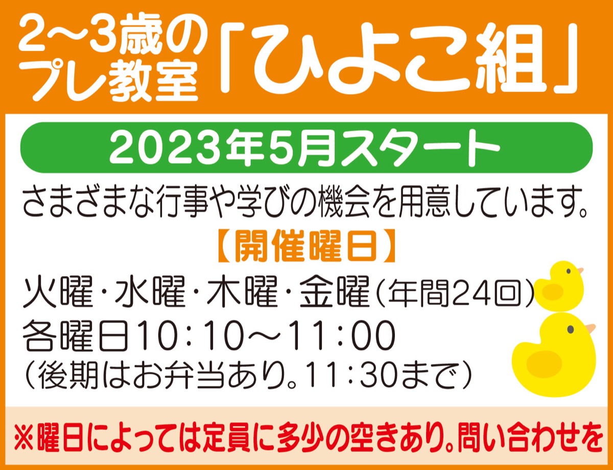 5月からは2〜3歳児(24年度入園)向けプレ教室「ひよこ組」も開始(下記参照)。1〜2歳児には行事に参加して楽しむメール会員「ふたば」、0〜1歳半までは保育室を開放する「ベビールーム」もあり。問い合わせは同園まで。