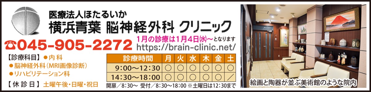 あざみ野駅から徒歩4分の横浜青葉脳神経外科クリニックは院長の他に第一線で働く経験豊富な非常勤医師8名が在籍している。頭痛・脳卒中・認知症・脊椎脊髄の四分野に特化した脳・脊髄の専門外来である。画像診断では診断精度を上げるためMRI検査を汎用機種1・5テスラから高精細機種3テスラMRIに2年半前入れ替えた。クリニックでは珍しい3テスラMRIによって素人がみてもわかる鮮明な画像が提供できるようになった。年頭にあたり院長に同院の特徴を聞いた。「世の中にある数ある医療機関の中で私たちのクリニックができることはほんのわずかな一部分でしかありません。そのわずかな部分を研ぎ澄まし患者さんの思いや判断を最重視する患者ファーストを基本医療として黒子役を演じながら患者や家族と伴走する努力を重ねています。私たちができない部分はできるだけ近隣にあるクリニックや地域の病院の優秀な先生と連携し遠隔地であっても高度医療を担う基幹病院の最先端の先生をご紹介する繋がる医療を大切にしています。私たちができることは患者さんの気持ちを思い量り最後は励ます医療で少しでも元気になって帰ってもらうことを目標としています。私たちのクリニックは人を励まし助けることで自分も他人も励まされ助けられる感謝の好循環を『チームほたるいか』の基本理念としています。『患者ファーストによる繋がる励ます医療』を目指す当院の脳外科医を上手に利用しませんか?」