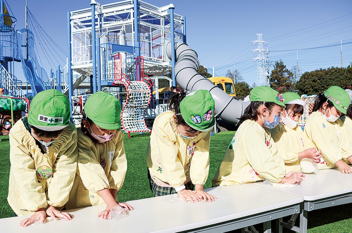 プロレスラーの武藤敬司さんや関取の水戸龍さんらが参加するなど、例年通り賑やかに行われた餅つき。当日は姉妹園のおおば白ゆり幼稚園の園児も参加した。園児たちは自園で栽培したもち米60kgを杵と臼でついて餅にするまでを「よいしょ」の掛け声とともに見学。その後、年長園児はビニール袋に餅を入れ、自分で潰して「のし餅」にして持ち帰った=写真。また、年中、年少園児も餅を土産にした。