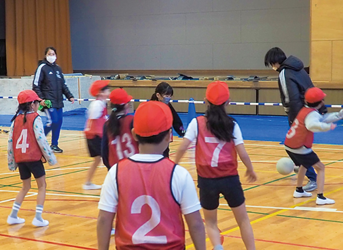 ボールを使った鬼ごっこなど、まずはボールに慣れることから。その後は児童チームと選手チームが試合を行った。児童らは得点を決めると大喜び。逆に決められると「悔しいー」と感情を露わにしていた。クラブの広報担当は「教育実習に行く選手も多いので、教える練習になる。良い体験をさせてもらっている」と笑顔で話した。