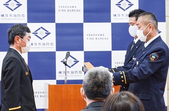 青葉区消防出初式が1月5日、青葉消防署で開催され各種表彰が行われた。主催は、同実行委員会(野路秀雄実行委員長)。当日は感染症対策のため式典は関係者のみで実施。横溝尚樹消防団長は「消防団は自分たちのまちは自分たちで守る精神で取り組んできた。今年も消防署と協力し、地域防災に取り組んでいく」と抱負を語った。