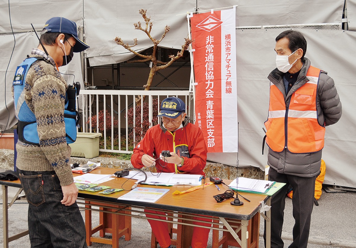 また、今回から防災訓練に加わったのが「横浜市アマチュア無線非常通信協力会青葉区支部」。発災時には市役所や区役所と各地域防災拠点をつなぐ「デジタル行政無線」が用意されているが、電波がひっ迫する恐れがある。そのため、複数の意思疎通手段として区役所と各地域防災拠点をアマチュア無線でつなぎ救援メッセージなどを届ける役割を担うのが同団体だ。当日は区役所のほか、訓練を行っていた美しが丘東小学校とも模擬送信訓練を行った=写真。飯島秀剛副支部長は「青葉区は防災拠点が41と他の区と比べて多く通信時間がかかる。訓練での対応が重要」と話す。