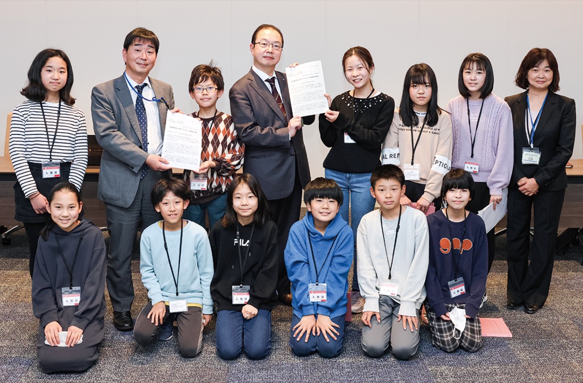 当日はクラスを代表し、児童11人が市庁舎を訪れて資源循環局と教育委員会事務局の各担当職員に要望書を手渡した。職員は「読ませて頂いて、取り組みに活用したい」と応じていた。