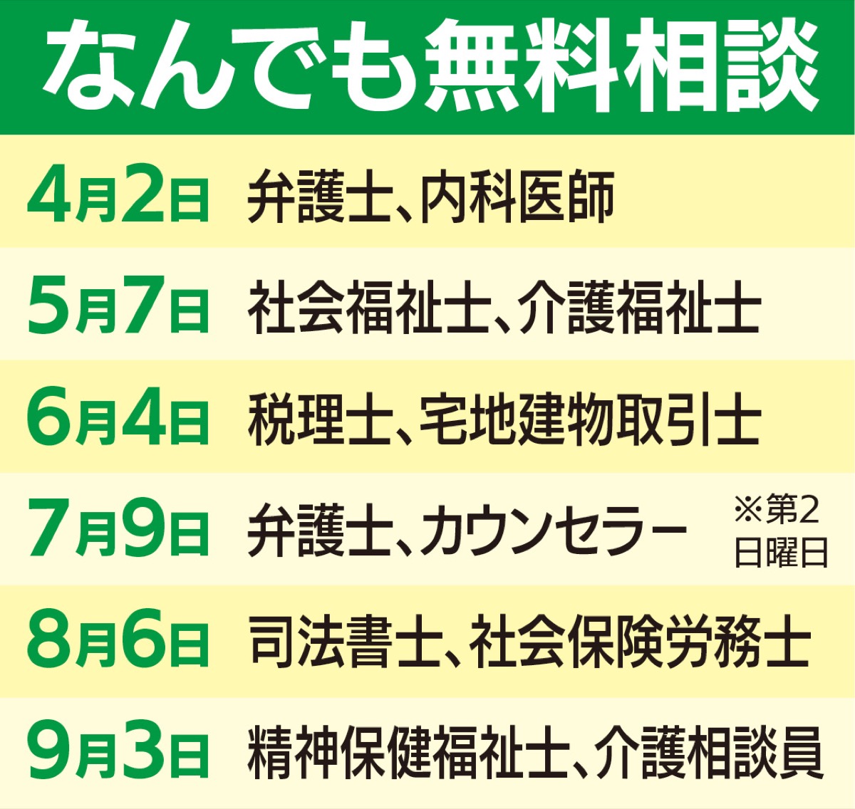 会場は市ケ尾町の「ふれあい青葉」(青葉区社会福祉協議会)で、午後1時から3時まで。相談は法律問題や相続、税金、年金、医療、介護、家庭内問題など各分野に対応。金品貸借や政治・宗教活動は行わない。