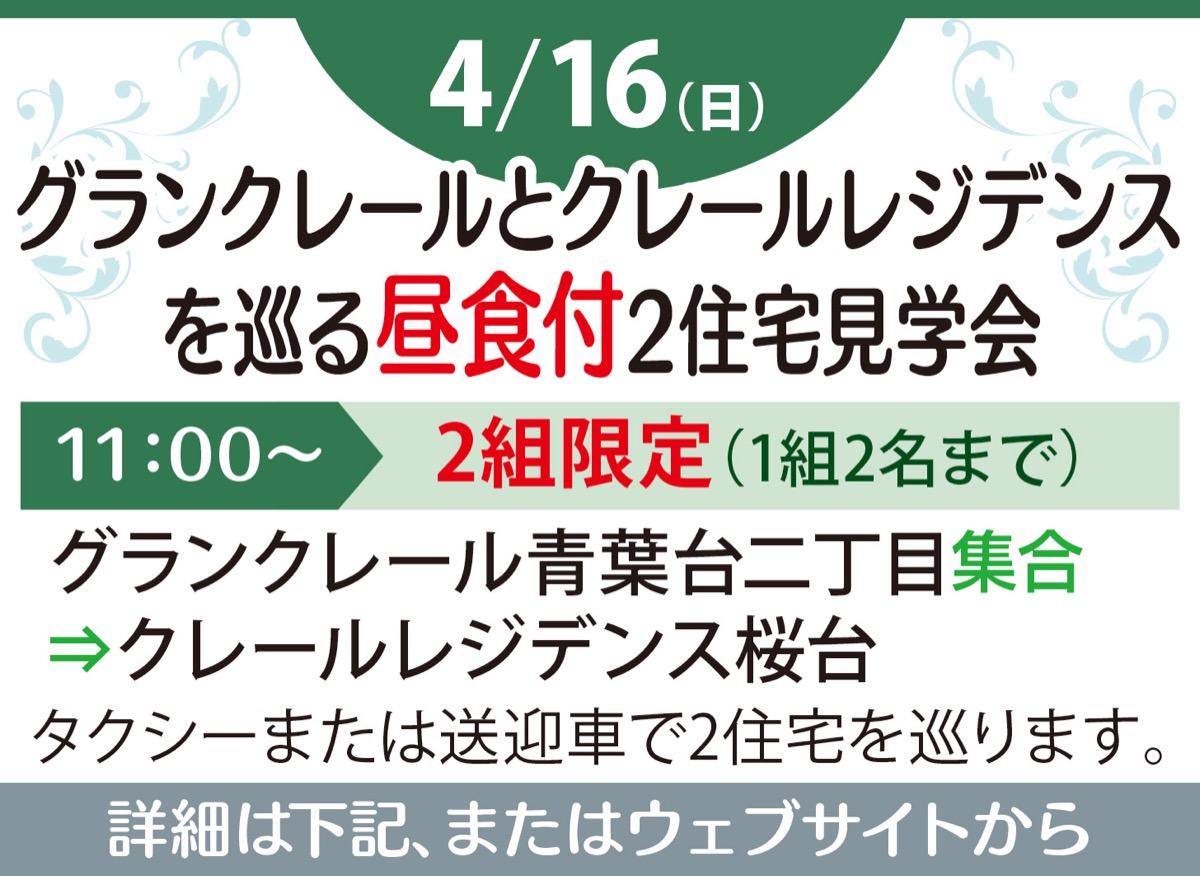 セミナーは4組限定(1組2名まで/応募多数時抽選)。午後2時開始で、参加者は10分前に同住宅集合。希望者は無料送迎あり(青葉区内のみ)。申込は下記まで。