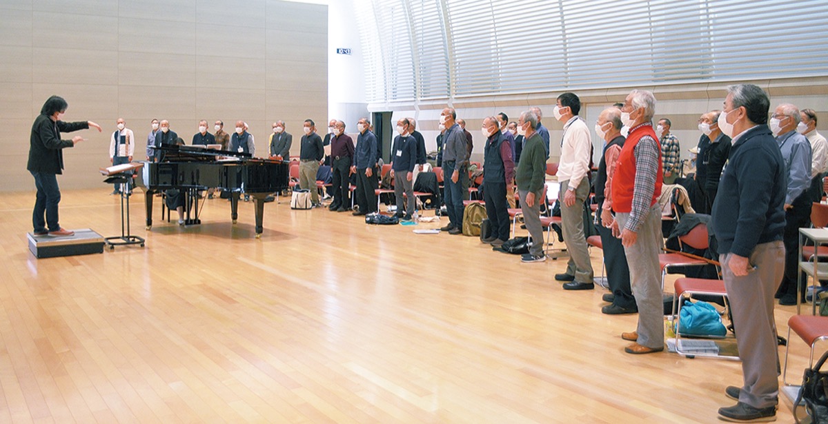 結成36年を迎え、平均年齢79歳、最高齢92歳。総勢60人がアクティブに活動する同団体。団員は退職後の人が多いことから1週間の始まりである月曜日の午前中に月4回活動する。入団者の8割が初心者で楽譜を読むこともできなかったというが「歌うことが好きな人たち」の集まりだ。コロナ禍も施設が利用できなかった3カ月間を除いて活動を継続し、団員数も増やしたという。「年齢的に全曲暗譜するのも一苦労」と代表の菅原邦宏さんは苦笑しながらも「聞く人の心に響く歌を届けたい」と練習に励み本番に挑む。