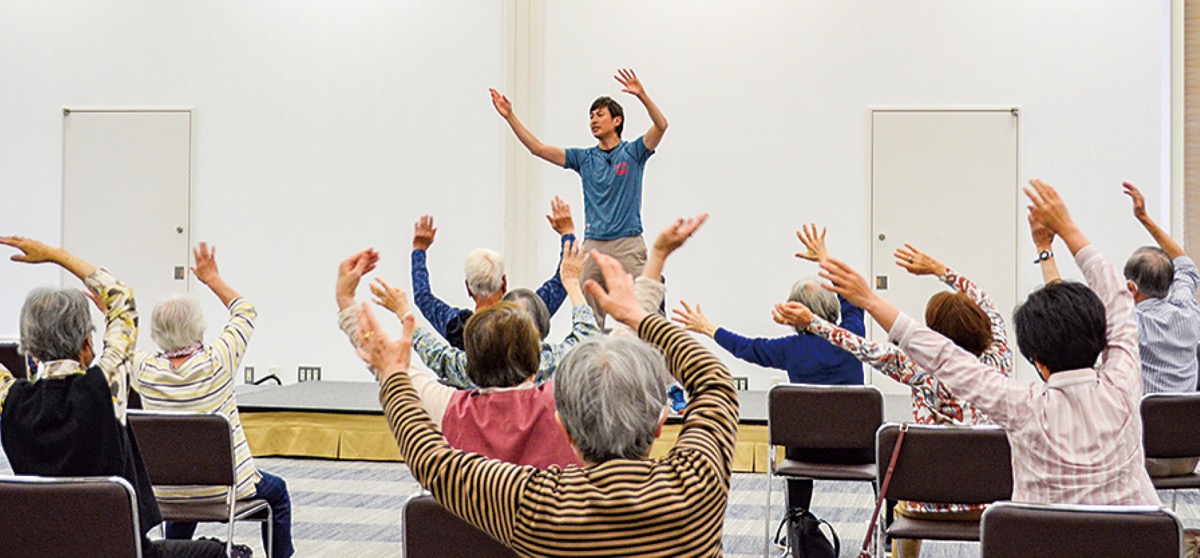 フェスタでは、転倒・認知症予防について研究し、筋活運動を指導する順天堂大学大学院の町田修一教授が、どのような生活習慣が認知症になるのかなど具体例を交えながら講演を行った。2部以降では認定NPO法人神奈川県転倒予防医学研究会による懐かしの音楽に合わせた転倒予防運動=写真、健脚度測定が行われた。地域の老人ホームやシニア住宅などの企業ブースの出展や国学院大学の学生もボランティアに駆け付けるなどまちぐるみで行われた。