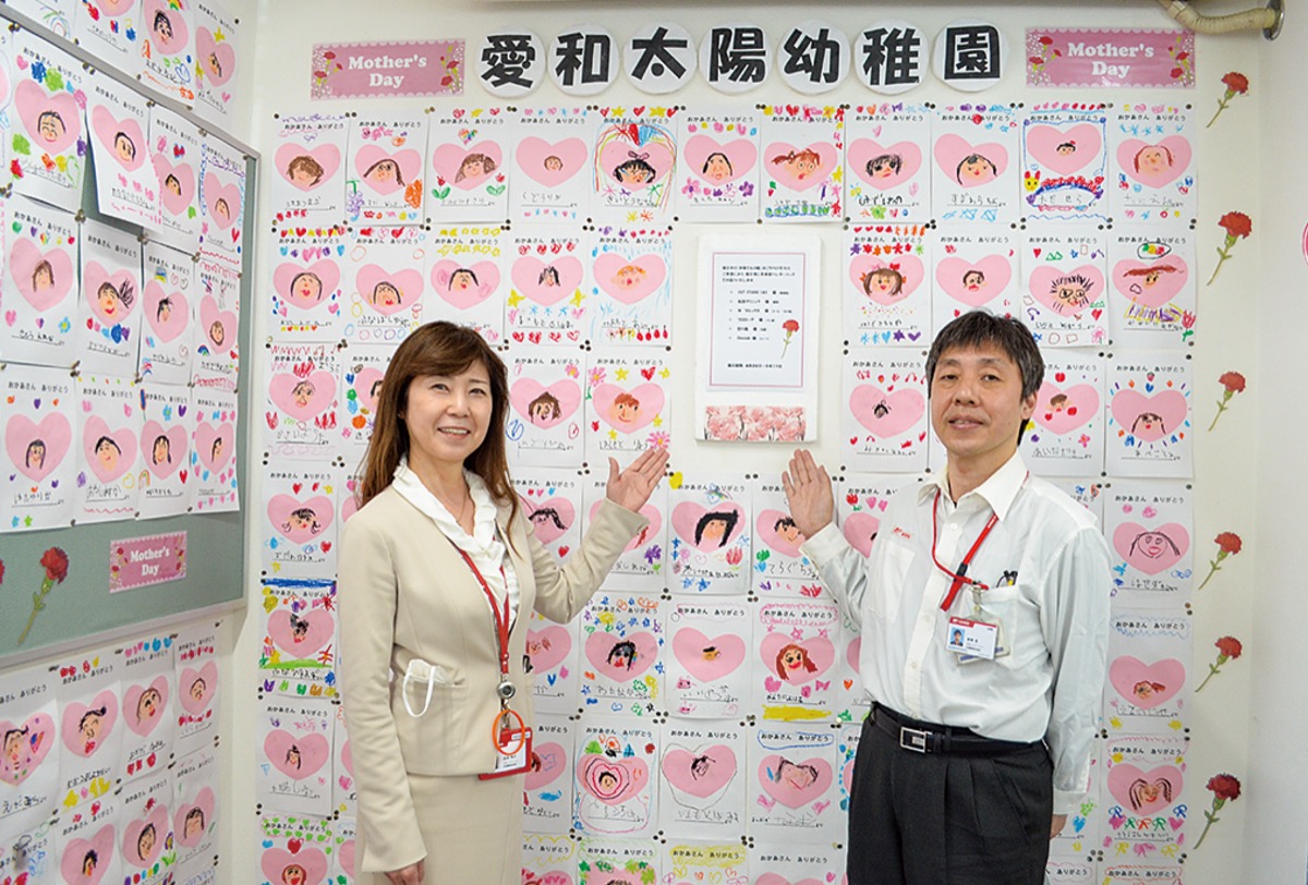 美しが丘西郵便局(武田伸子局長)が毎年、「母の日」に合わせて愛和太陽幼稚園の園児たちが描いた「お母さんの絵」を壁一面に掲示している。今年は4月20日から5月11日まで同園の年長園児127人が描いた絵が飾られ、来局者を和ませていた。
