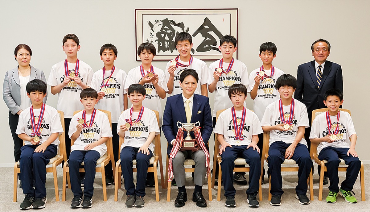 全国大会に出場した山内ミニバスケットボールクラブ(青木一泰監督)の男子選手が5月16日、横浜市庁舎を訪れ、山中竹春市長に3戦全勝の結果を報告した=写真。
