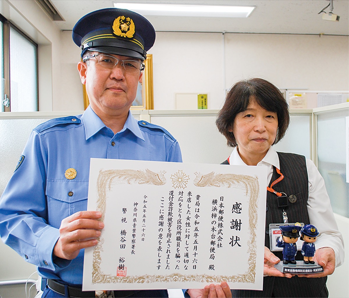 還付金詐欺を未然に防いだとして5月26日、横浜柿の木台郵便局の吉田富子さんに青葉警察署から感謝状が授与された=写真。
