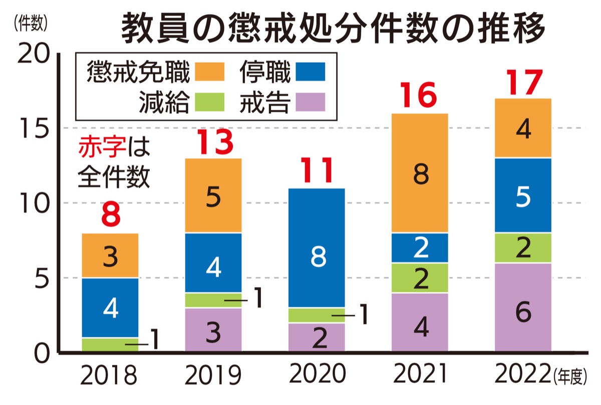 年度ごとの処分件数を見ると22年度17件、21年度16件、20年度11件、19年度13件、18年度8件。処分理由別に見ると、この間の最多はわいせつで18件。セクハラ9件、不適切な指導8件、窃盗7件、体罰6件と続いた。