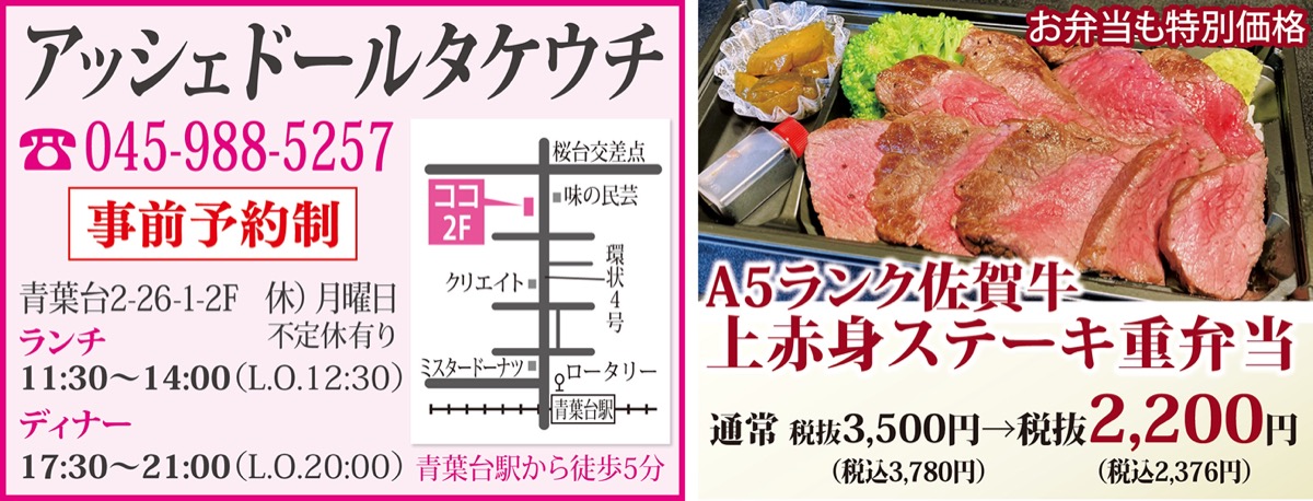 『ミシュランガイド横浜・川崎・湘南2015特別版』にも掲載された青葉台の名店「アッシェドールタケウチ」が期間限定で「佐賀牛特別キャンペーン」を実施する。