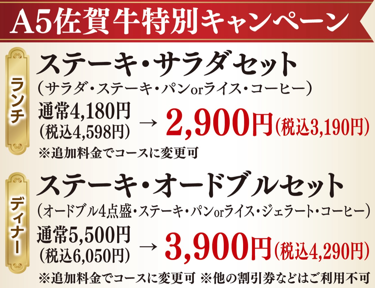 7月23日(日)までの期間限定。ランチのサラダセットは2900円(税込3190円)、ディナーのオードブルセットは3900円(税込4290円)。追加料金でコースへも変更可。店内での食事は完全予約制。夏を前に、最高の佐賀牛で元気を補給してみませんか。