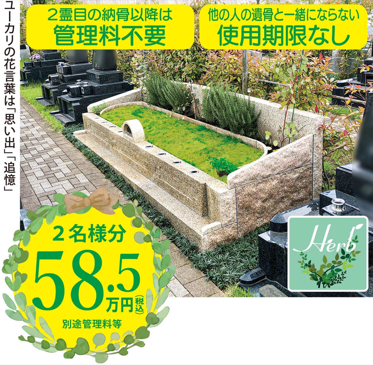 ハーブに包まれた小さな庭のような墓地は、夫婦や親子2人で入れるほか、個々に納骨棺があるため他の人とは一緒にならないので安心。2霊が納骨された後は管理料が不要になり、将来、合祀されることもない。