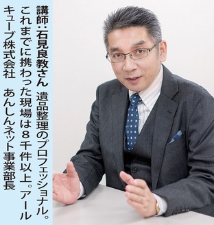 衣類や家具、思い出の品々の扱いに困っている人を対象に、「遺品整理人」として人気の石見良教さん=写真=を講師に迎えて生前整理を学ぶ。一般家庭でも家財は5〜6tになるため、元気なうちに片付け始めるのがベストだ。「生前整理は心の整理。ぜひ片付けのヒントを聞きに来てください」と石見さん。参加者に小冊子進呈。