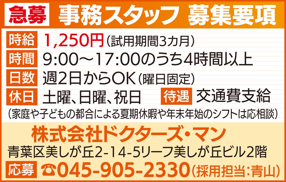 たまプラーザ駅徒歩3分、全国900カ所以上のスポーツジムやクリニック、整骨院などに自社開発の水素水サーバーや水素吸入機を販売・レンタルしている、株式会社ドクターズ・マンが、業務拡大に伴い、事務スタッフを募集している。