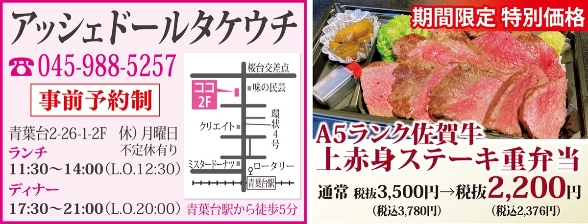 『ミシュランガイド横浜・川崎・湘南2015特別版』にも掲載された青葉台の名店「アッシェドールタケウチ」が、この夏、タウンニュース読者限定のセットとコースを特別価格で提供してくれる。
