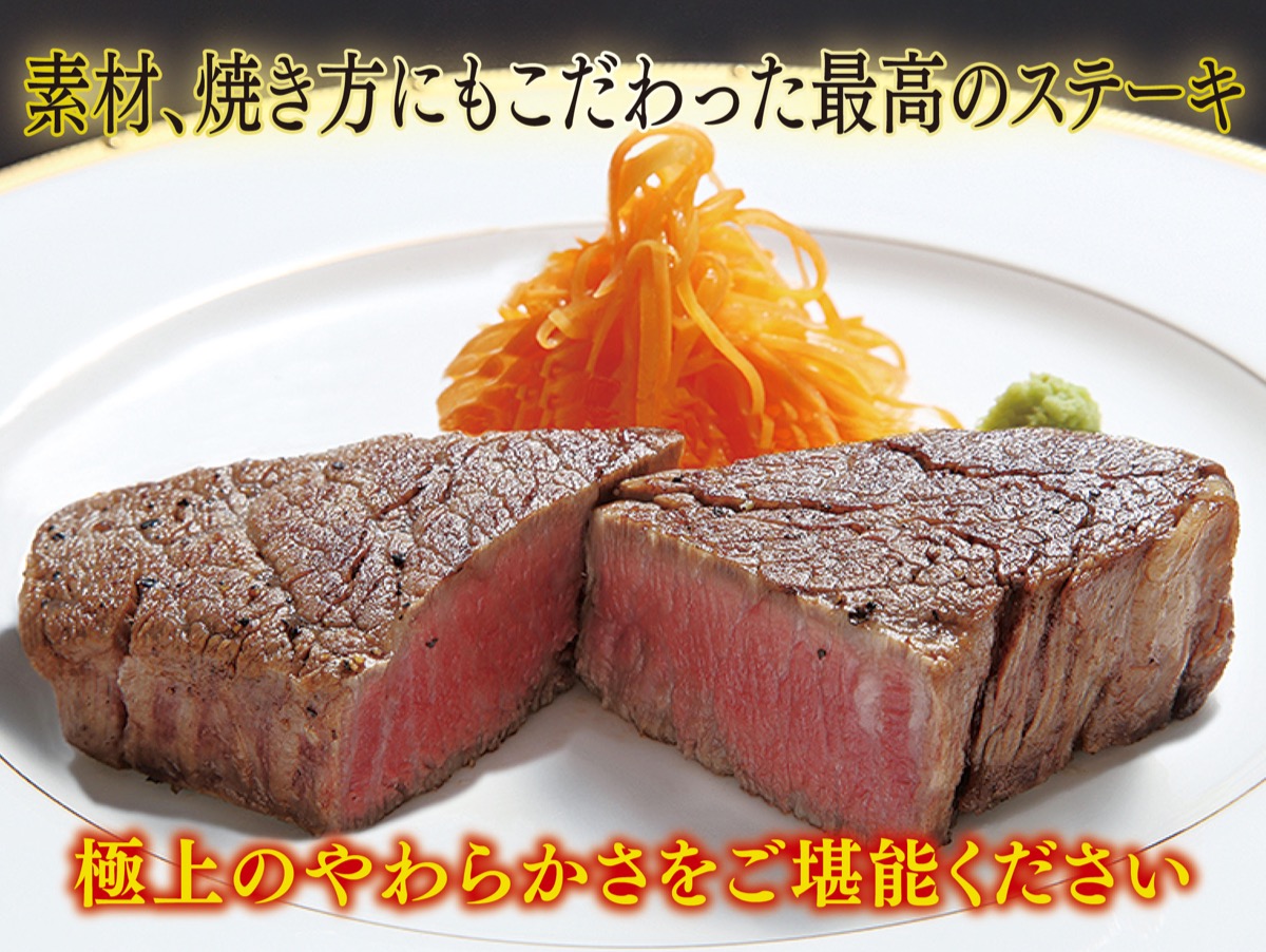 使用するのは厳選された国産牛のヒレとサーロイン。指定農家で長期肥育されたA4・A5ランクのみを使用する。その最高級のお肉を、旨味を閉じ込めながら柔らかく焼き上げるため、芳醇な肉の旨味を堪能できる。