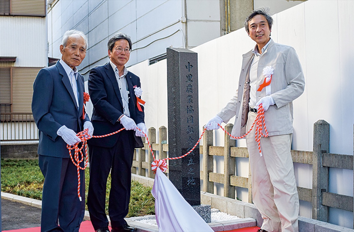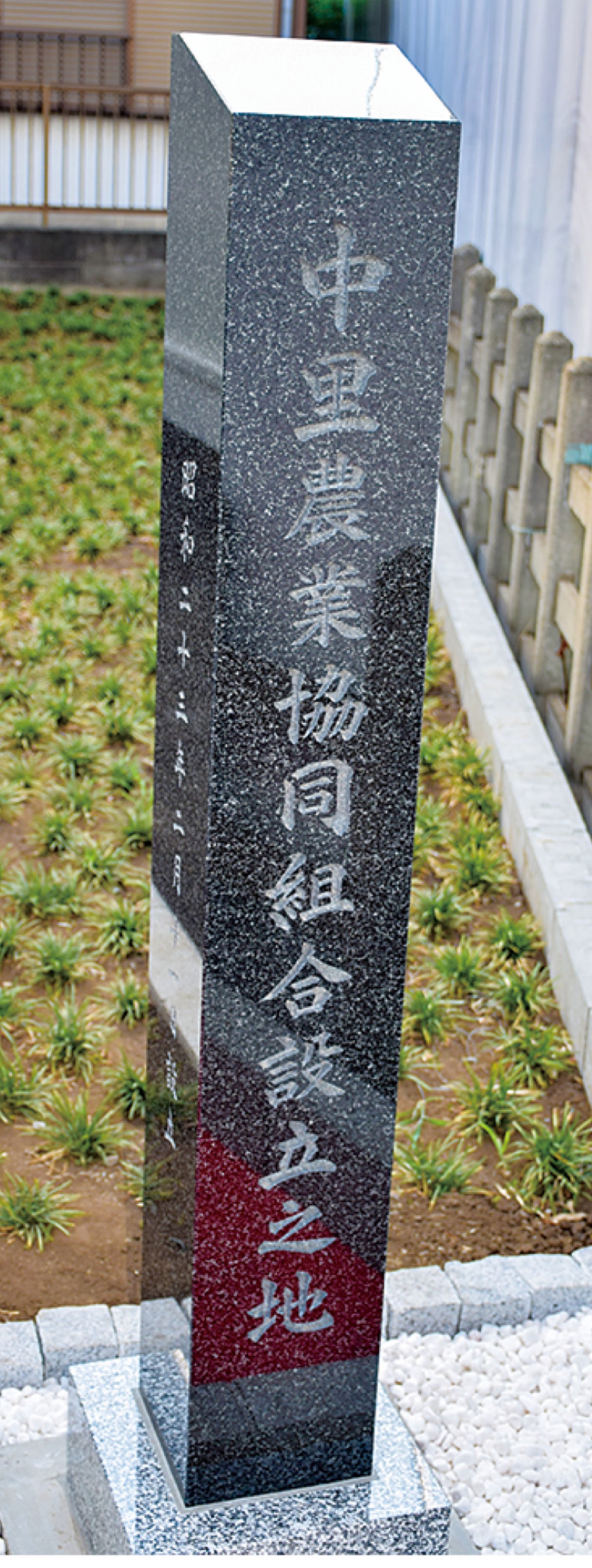 石碑建立は横浜農協理事の宮田吉秀氏の発案。「中里農協の軌跡をシンボルとして後世に残したい」と提案し、支店運営委員らの賛同もあり実現。現在、JA横浜の倉庫として活用されている発足の地に建立された。