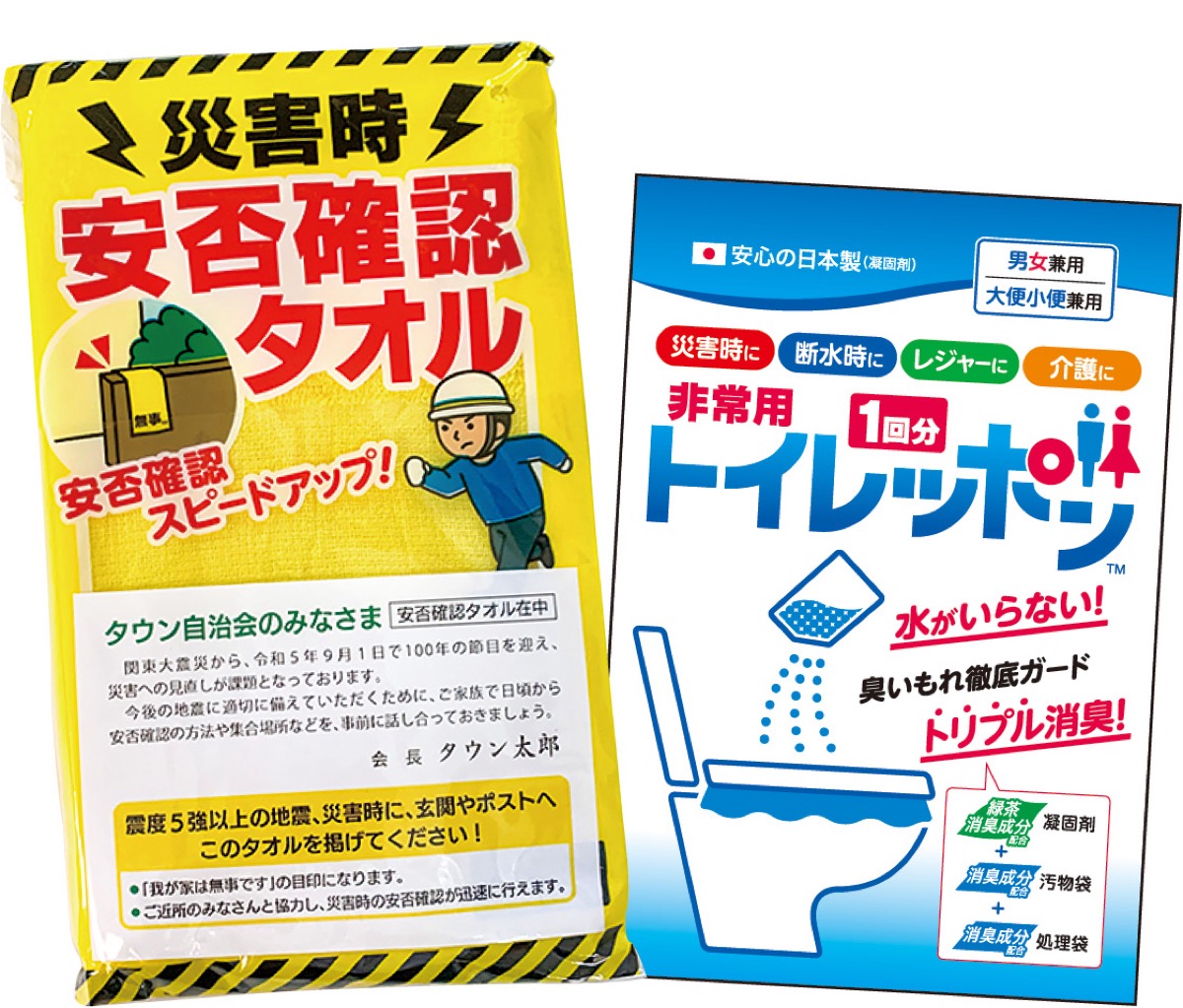 タウンニュース社では自治会町内会等の代表者や防災担当者に、注目の防災商品を掲載したカタログを送付している。カタログには非常用簡易トイレや救急セット、ランタン、アルミブランケット、給水バッグなどのほか、便利アイテムセットも。売れ筋商品のサンプルもプレゼント可(単会につき1回限り)。安否確認タオルなどニーズの高い商品のチラシも同封。掲載商品は弊社に電話で簡単に注文できる。