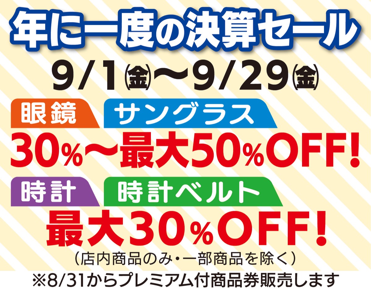 そんな同店の決算セール。今年は藤が丘商店会プレミアム付商品券が使えるのでさらにお得といえる。サングラスや眼鏡が30%から最大50%オフ。さらに店内の腕時計も最大30%オフとなる(一部商品を除く)。