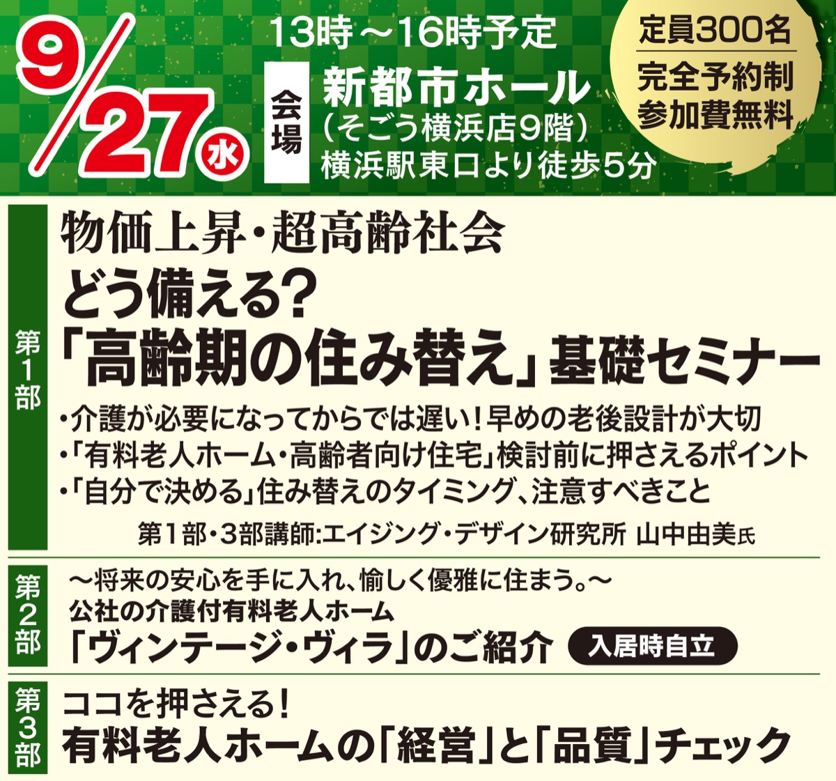 そこで今回のセミナーは高齢者向け住宅に精通する講師が、介護が必要になる前から老後設計を立てる重要性や高齢者向け住宅検討前に押さえるポイントを解説。第三部では有料老人ホームの経営と品質の見極め方も説く。第二部では公社の有料老人ホーム「ヴィンテージ・ヴィラ」の紹介も。先延ばしにしがちな将来の問題を考える良い機会としてぜひ参加を。