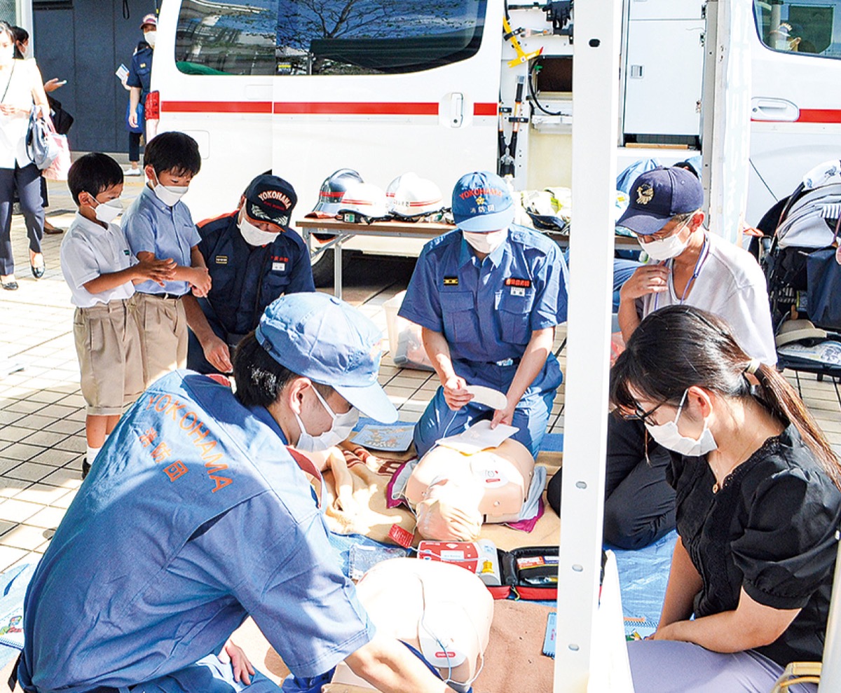 1階では救急車の見学やAEDを使用した心肺蘇生法体験、よこはま防災e─パーク体験などを通じて救急・防災について理解を深めることができる。子ども用救急服・防火衣を着装しての写真撮影や医師による健康相談ブースなどもあり、子どもから大人まで楽しめるイベント。2階では「ポケモンぼうさいきょうしつクイズ」も実施。