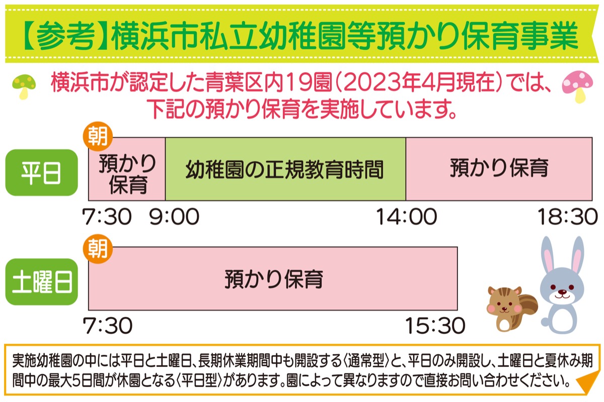 青葉区内では、19園が同事業認定園として預かり保育を実施(通常型か平日型かは各園に要確認)。利用には保護者の労働状況などの条件があり、保育の必要性に関して、横浜市から認定を受ける必要がある。