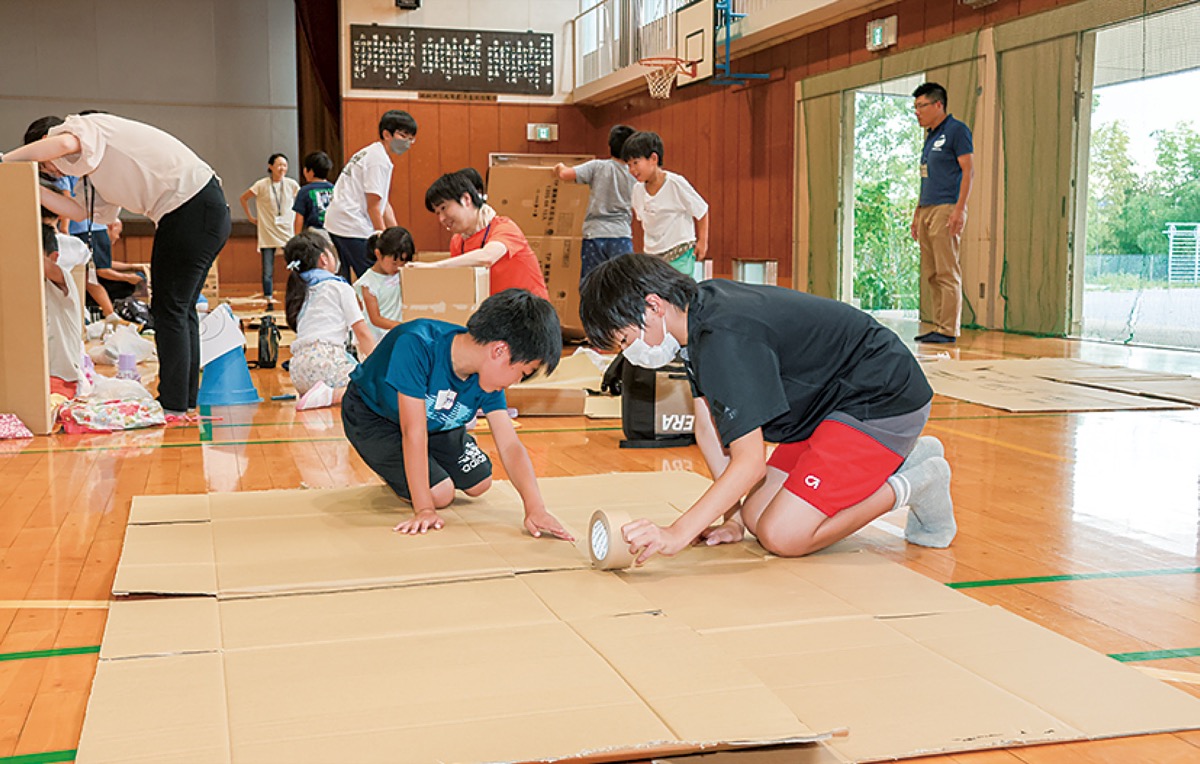 続いて段ボールベッド作りを体験=写真。体育館が就寝場所ということで、児童たちは段ボールをつなぎ合わせて敷布団代わりに。夕食には防災かまどを使い、炊き出し訓練も兼ねて調理されたカレーを食べたほか、谷本地区青少年指導員連絡協議会による恒例行事「親子映画の夕べ」も同時開催され、映画を楽しんで初日は終了。2日目は通学路上の危険予測など、災害想像ゲームも行われ、滞りなく2日間を終了した。